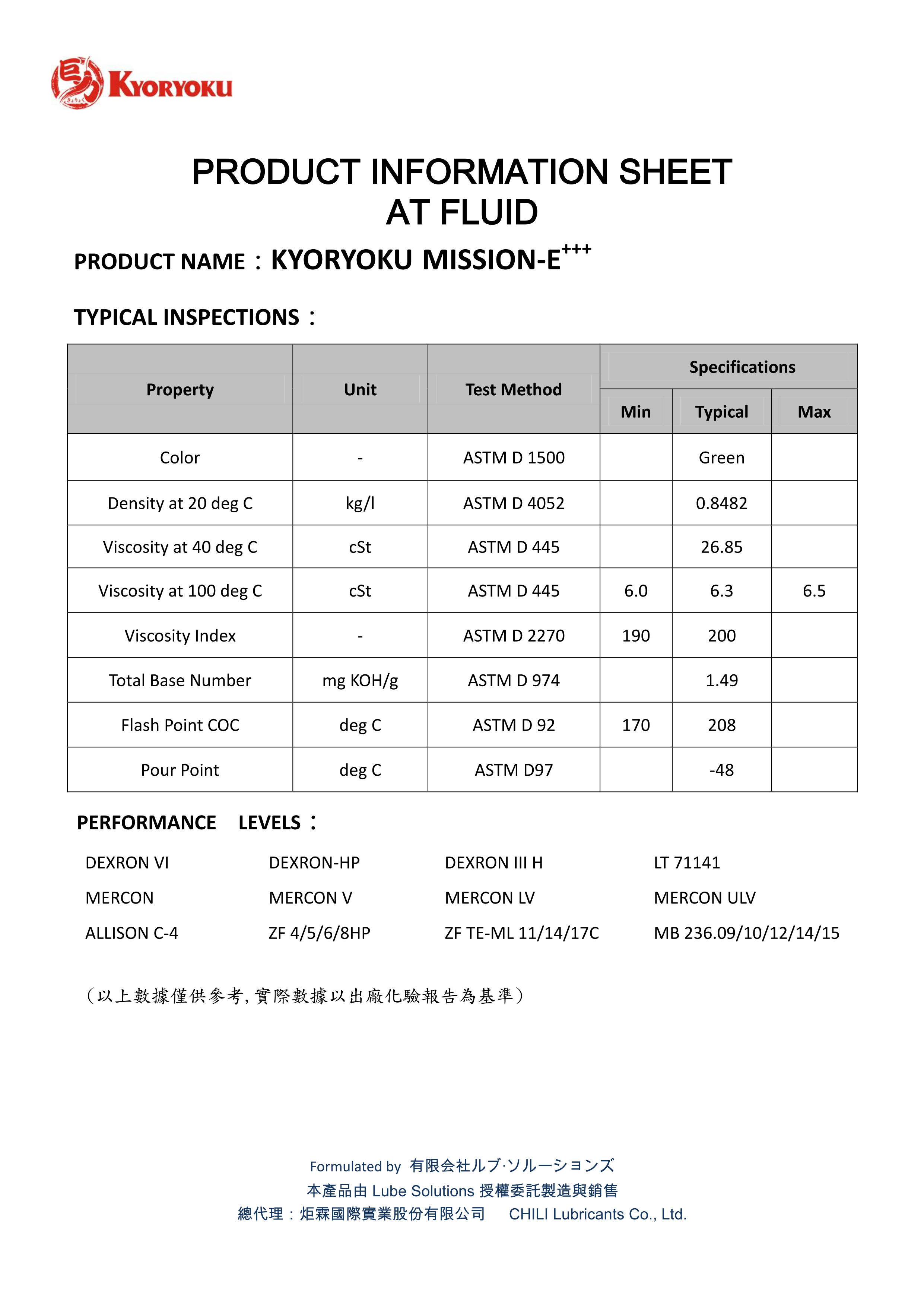 ♦黏度指數高達 200 以上,能有效降低變速箱過熱